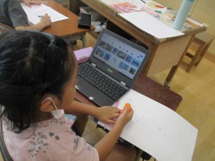 図画工作科【1年生】 公開日 2021/09/01 更新日 2021/09/01 1年生 「のってみたいな いきたいな」という絵を製作中です。 乗ってみたい生き物をクロムブックで調べると、詳しい模様や姿まで描けそうです。