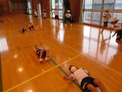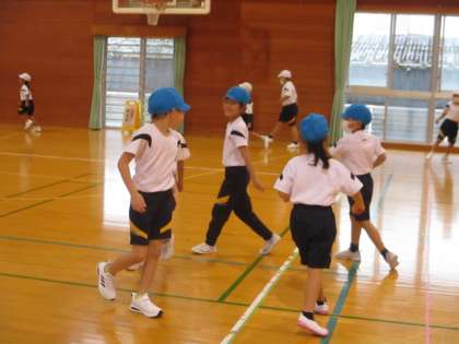 友達の動きをまねして、体を動かしました。曲に合わせて、上手に表現することができましたね。