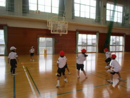広い体育館で友達と一緒にドッジビーができて、うれしそうです。