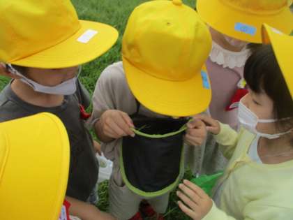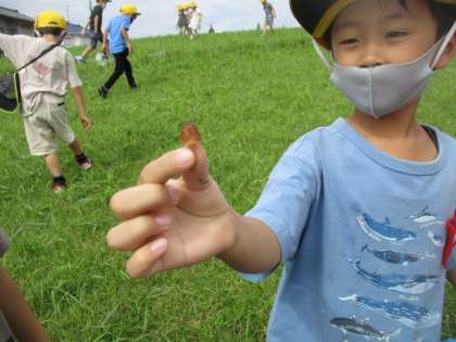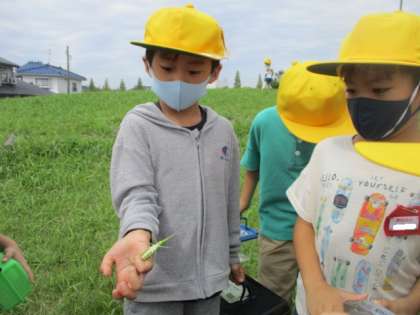 「やっと、バッタをつかまえたよ。」