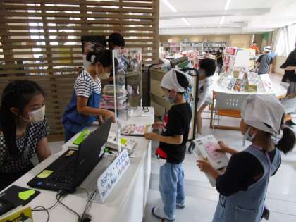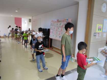 貸し出しの長蛇の列ができました。明日から3連休です。ゆっくり本を読んでくださいね。