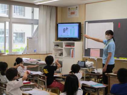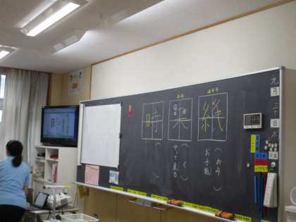 テレビの画面に漢字を映し出して、書き順を確認しています。