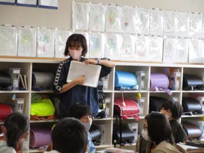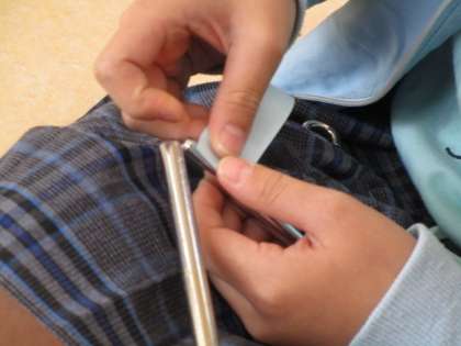 音が出るときの「ものの震え」を調べています。トライアングルに付箋を付け、音の出し方を変えて様子を観察しました。
