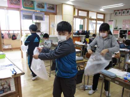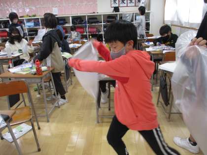 閉じ込めた空気は、押されるとどうなるのか、空気を入れた袋を使って考えました。