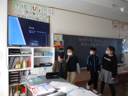 地震に備えて学校でのどのような取組をしているのか、調べたことを班ごとに発表しました。