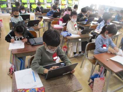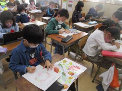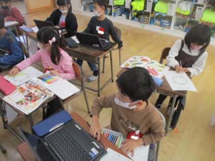 クロムブックで調べたり、教科書から見付けたりした「秋の木の実や葉っぱ」を使って素敵なリースを考えました。