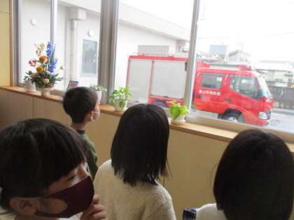 なんと!消防士さんは「はしご車」に乗ってこられました。