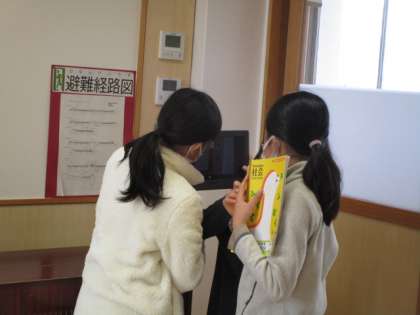 校内の消火器や避難経路図等を探し、クロムブックで撮影しています。どこにどんな設備があるのか学びを深めます。
