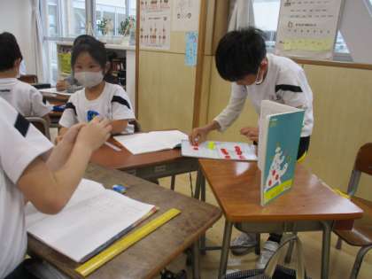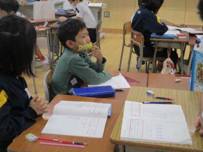 2×5と5×2、答えは同じだけど式が違うと何が変わるのかな?ノートに図をかいたり、おはじきを動かしたりして、友達に一生懸命説明しています!
