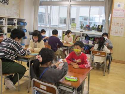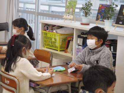 九九の問題を出し合っています。2〜5の段まで、だんだん覚えてきています!