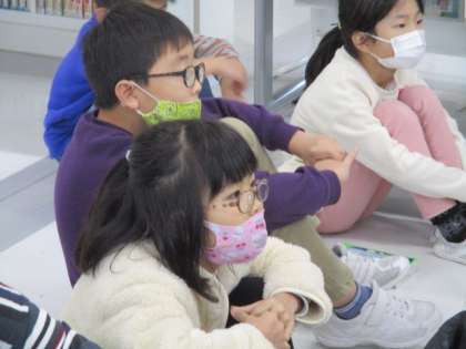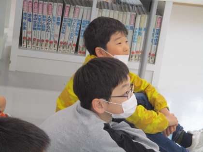 図書室で読み聞かせをしてもらいました。本の内容のクイズもあり、楽しんでいる様子でした。最後には、好きな本を借りて読書をしました。