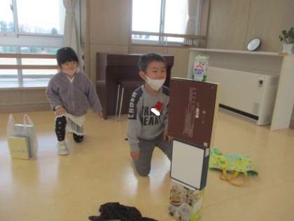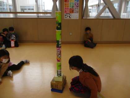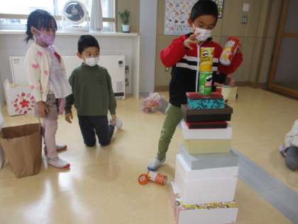 箱を積み立ててタワーをつくったり、キリンや列車をつくったりしました。触れることで形の特徴に気づき、仲間分けも上手にできていました。