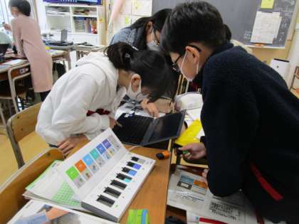 市教育センターからお借りしたMESHを用いて、プログラミングの学習をしています。プログラムをつくり、MESHを点灯させたり、明るさを変えたりしています。
