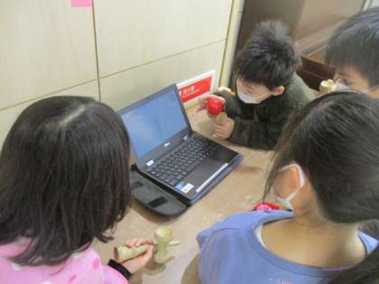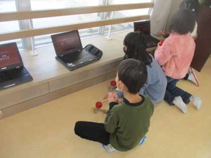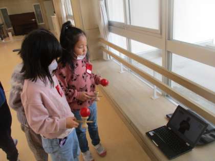 クロムブックを見て「剣玉」の練習中・・・