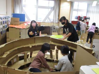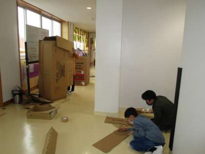 段ボールカッターを使いながら、居心地のよい場所をつくっています。ダイナミックで楽しそう・・・。