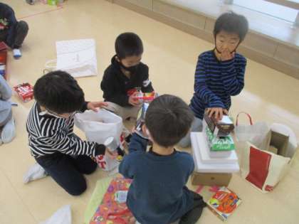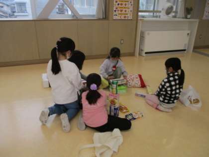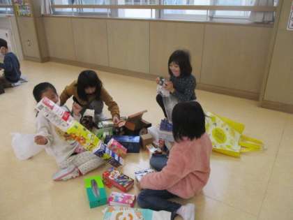算数で持ってきた箱を使って、みんなで形遊びをしました。