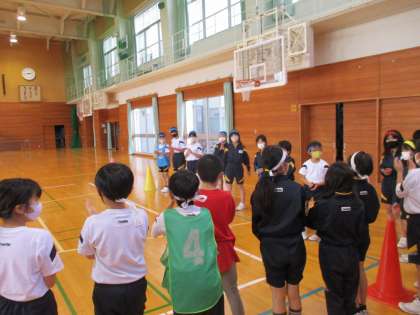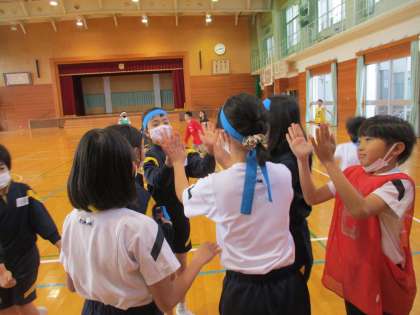 キックベースボールの授業では、団の友達と作戦を立てたり、励まし合ったりする姿がすてきでした。用具の準備や片付け、主審や副審も、自分たちで責任をもって行うこともできました。今日は、2学期最後の試合で、団を超えて応援したり、ハイタッチをして喜び合う姿がたくさん見られました!