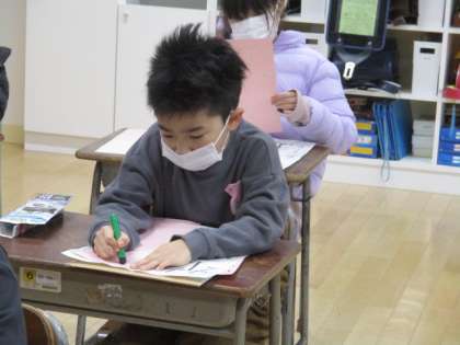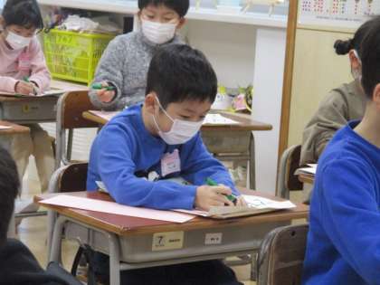「竹うま」と書きました。冬休みの練習の成果を出せるよう、一文字ずつ丁寧に書いています。