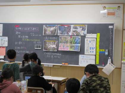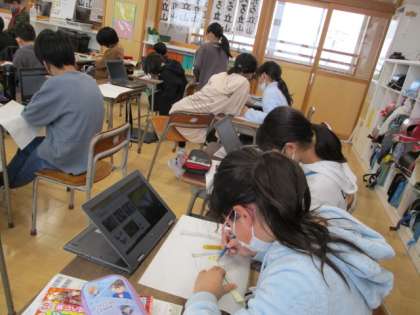 生き物を版画で表します。下絵の参考になるように、クロムブックで生き物を調べています。
