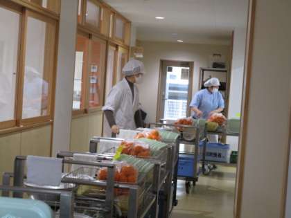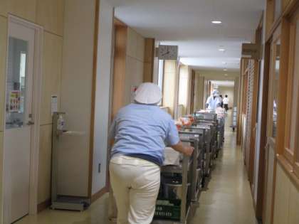調理員さんが、給食のワゴンをこのように運搬しています。