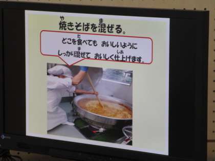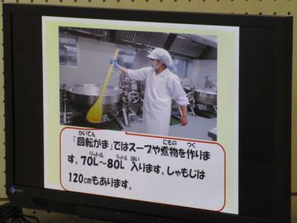 例えば、やきそばをかき混ぜるしゃもじは、120センチメートルもあり、1年生の身長ぐらいあるという話がありました。調理員さんが力強く混ぜてくださっていることが分かりました。
