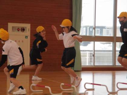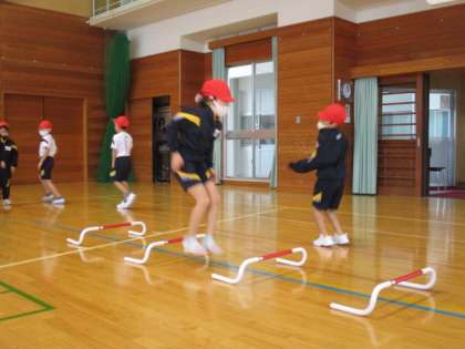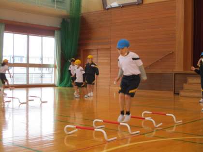 馬跳びの前に両足を揃えて跳ぶ練習をしています!