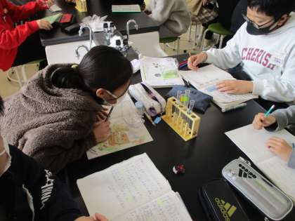 塩酸や炭酸水に金属を入れるとどうなるか調べました。真剣に観察していました。