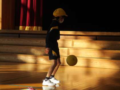 「♪あんたがたどこさ」の音楽に合わせて、ボールを使って体を動かしました。