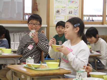 給食時間にしてもらえる「読み聞かせ」を、今日も楽しく聞いています。