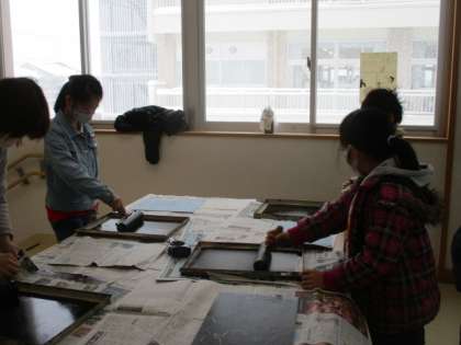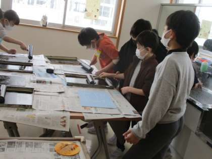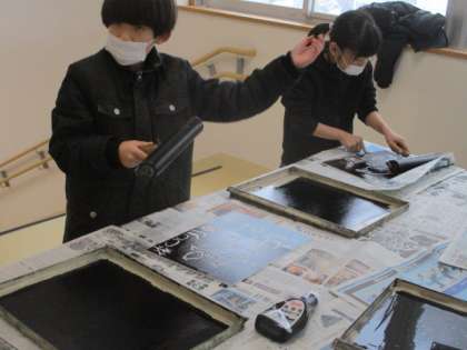 版画の板にインクをのせています。