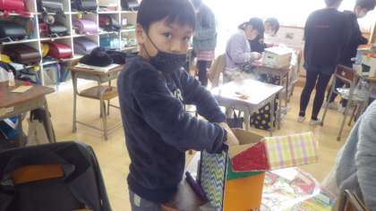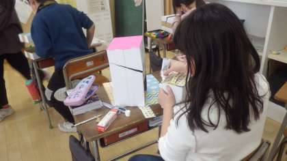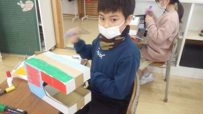 箱にシールを貼ったり、紙を付けたりして、どんどん作品が進化しています。