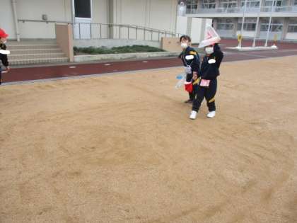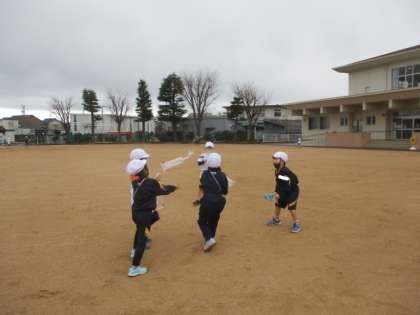 生活 傘袋ロケットをつくって遊んだよ。(1年生)