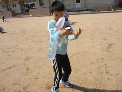 「自分で飛ばした傘袋ロケット、キャッチできたよ!」