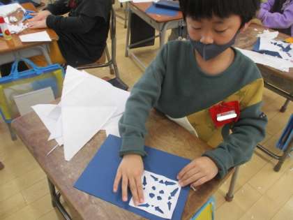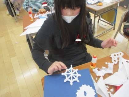 和紙を使って雪の結晶をつくりました。