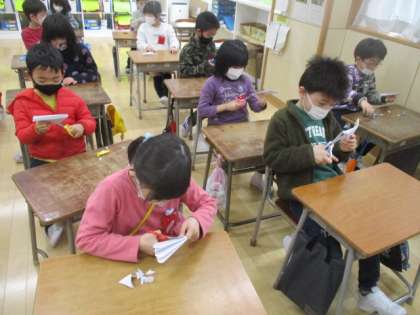 和紙のような薄い紙で切り紙をし、絵の具を垂らして花火のような模様を作りました。