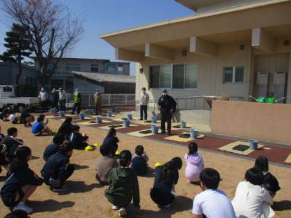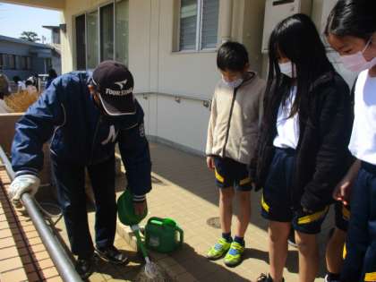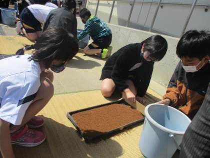 ひまわり交流会の方の話を聞いた後、土を平らに入れたり、種を均等にまいたりしました。