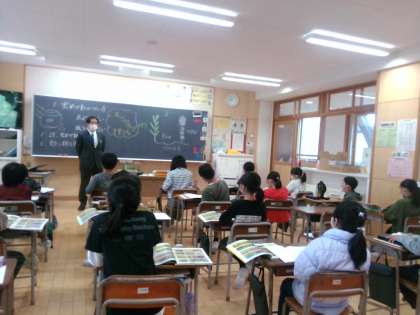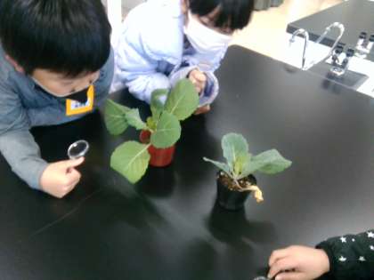 モンシロチョウについての動画を見た後、キャベツの苗を見ました。キャベツに顔を近づけ、匂いをかいだり虫眼鏡で観察したりしました。