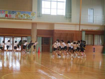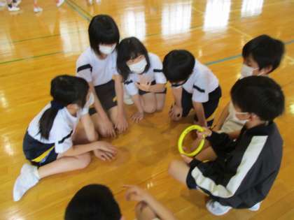 色団対抗で、リレーやしっぽとりを行いました。話し合って作戦を考えています。
