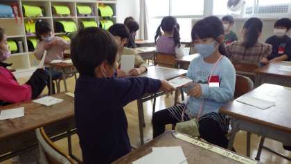 国語の学習で、自分の名前や好きなものを伝える自己紹介カードを作り、「どうぞよろしくの会」でお友達とカードを交換しました。