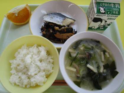 ・ごはん ・牛乳 ・鰆の塩焼き ・ひじきの炒め煮 ・高野豆腐のみそ汁 ・サンフルーツ