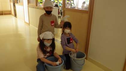 ぞうきんの使い方に慣れ、自分の担当場所を一生懸命きれいにしています。
