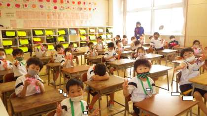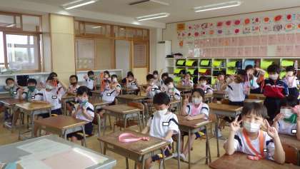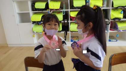 学校探検の後、2年生からメダルをもらいました。1年生は「ありがとう!」とうれしそうにもらい、友達と見せ合いながら喜んでいました。