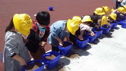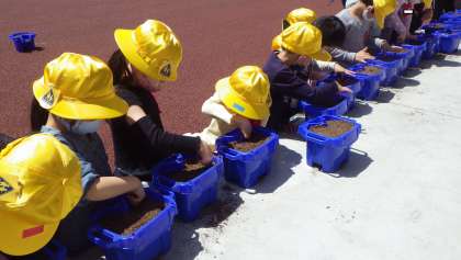 土に指で穴を作り、種を入れました。真剣です。