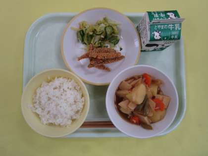 ごはん 牛乳 きびなごのさくさく揚げ あわせ和え 豚肉とじゃがいものうま煮