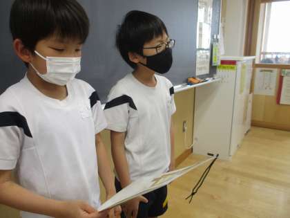 朝の会の司会を英語で行っています。 何も見なくても、すらすら言えるようになってかっこよかったです!!