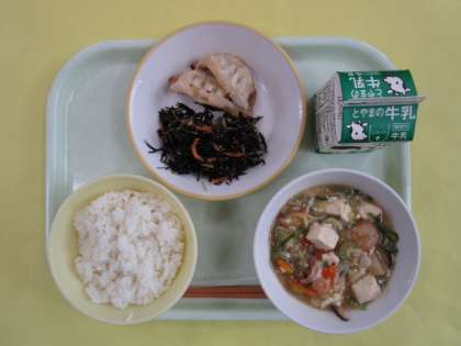 ごはん 牛乳 えびと豆腐のうま煮 焼きぎょうざ ひじきのごま和え