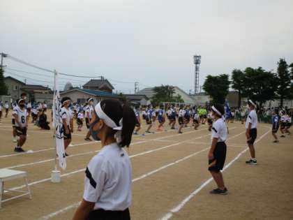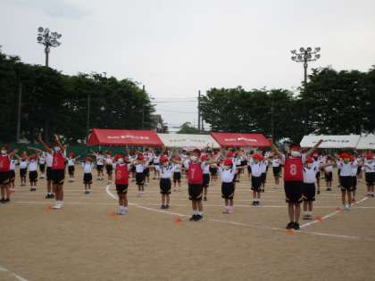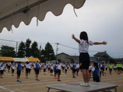 運動委員会の子供が前に立ち、手本となるようにきびきびと体操をしています。