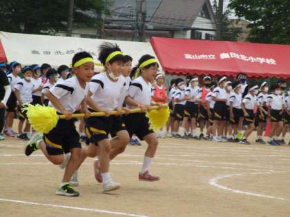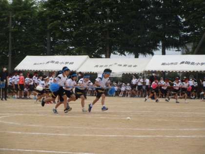 中学年の団体競技は「奥北ハリケーン」です。4人で1本の棒を持ち、力を合わせて走りました!