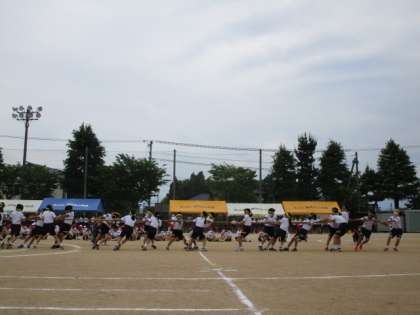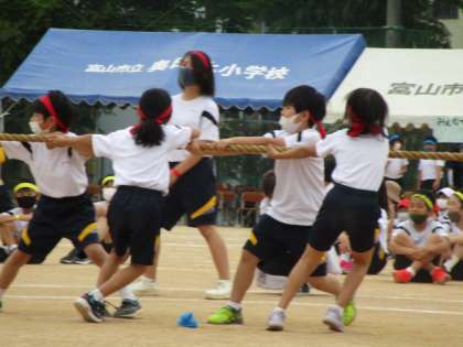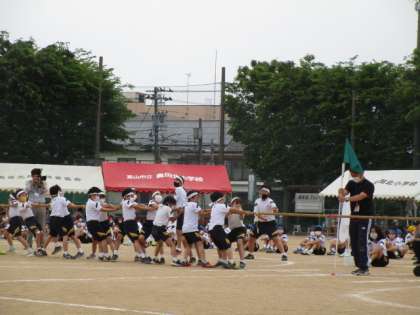 中学年の綱引きです。心を一つに、力いっぱい引っ張っています。