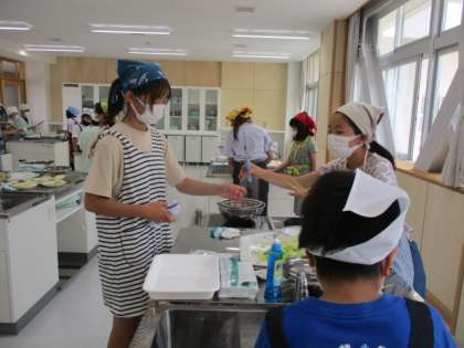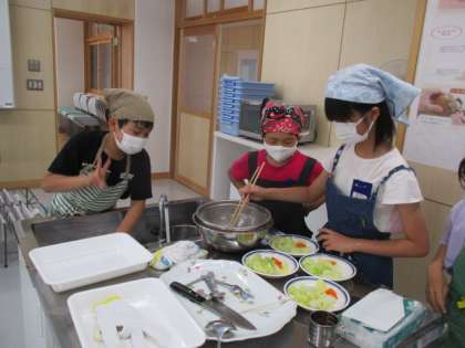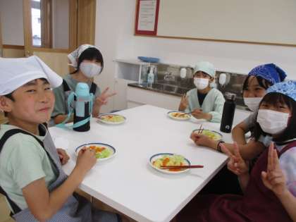 家庭科室での初めての調理実習でしたが、友達と声をかけ合い、協力して「ゆで野菜サラダ」を作ることができました。